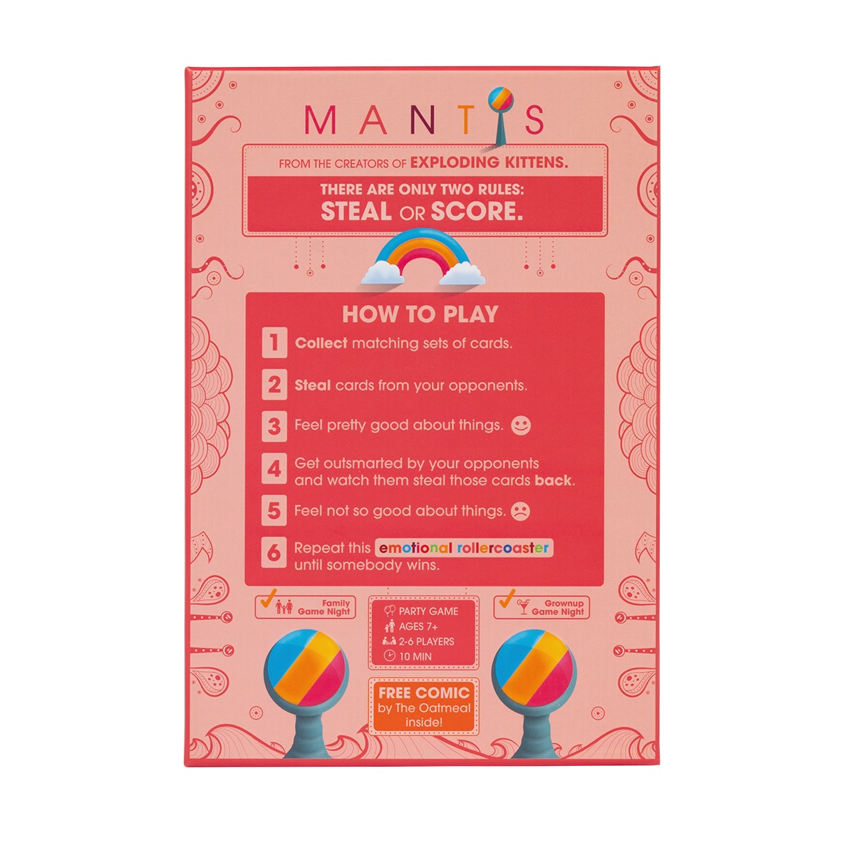 MANTIS ESTE UN JOC DE CARTI CONCEPUT ATAT PENTRU COPII, CAT SI PENTRU ADULTI, CU SIMPLICITATEA UNO® SI COMPLEXITATEA GIN RUMMY. Exista doar doua reguli: Fura sau Inscrie. Aduna seturi de carti potrivite furand de la adversarii tai. Te simti bine cu lucrurile pe care le-ai facut, apoi nu chiar atat de bine, deoarece adversarii iti fura cartile inapoi. Repetati acest rollercoaster emotional pana cand cineva castiga jocul. Varsta 7+. 2-6 jucatori.