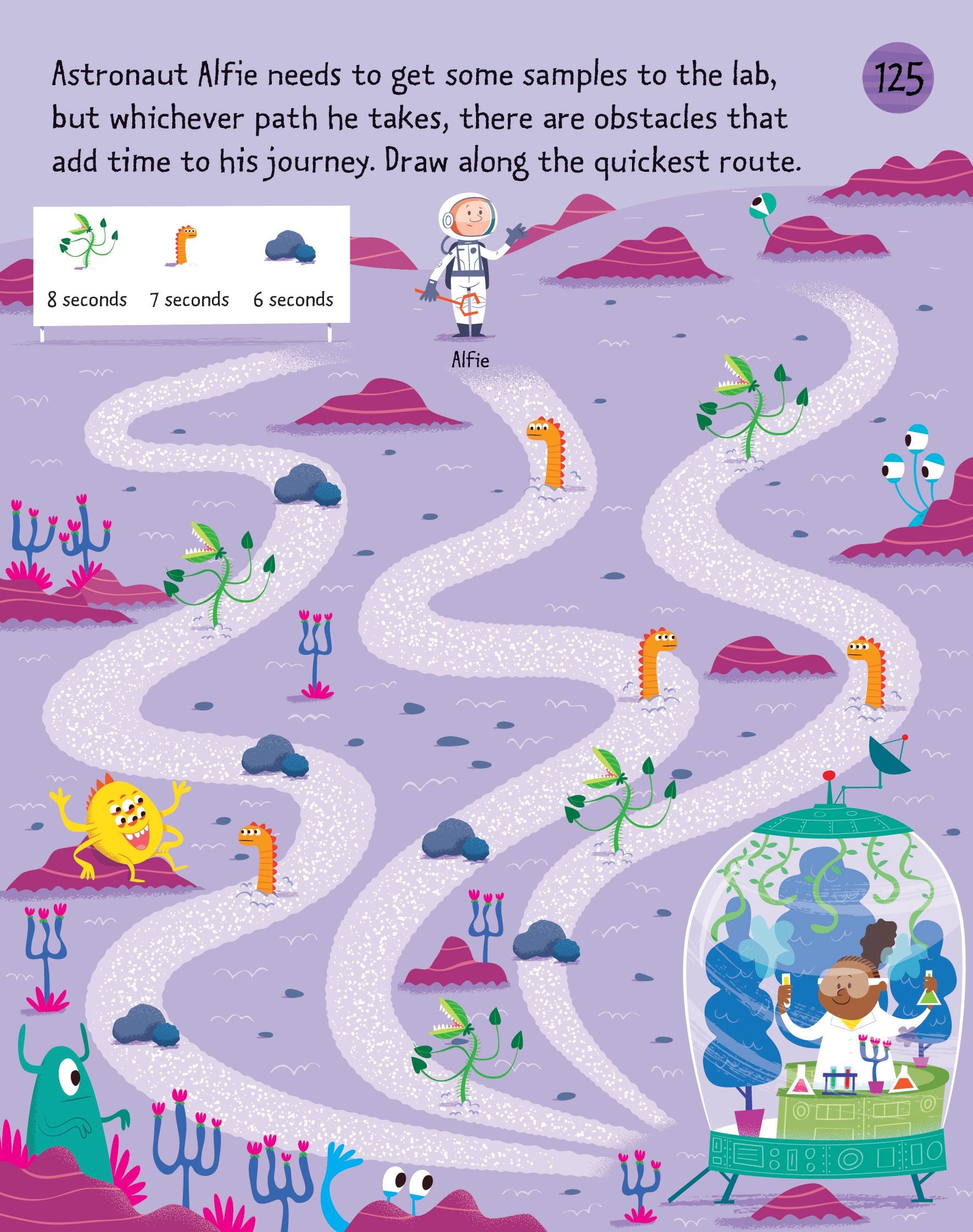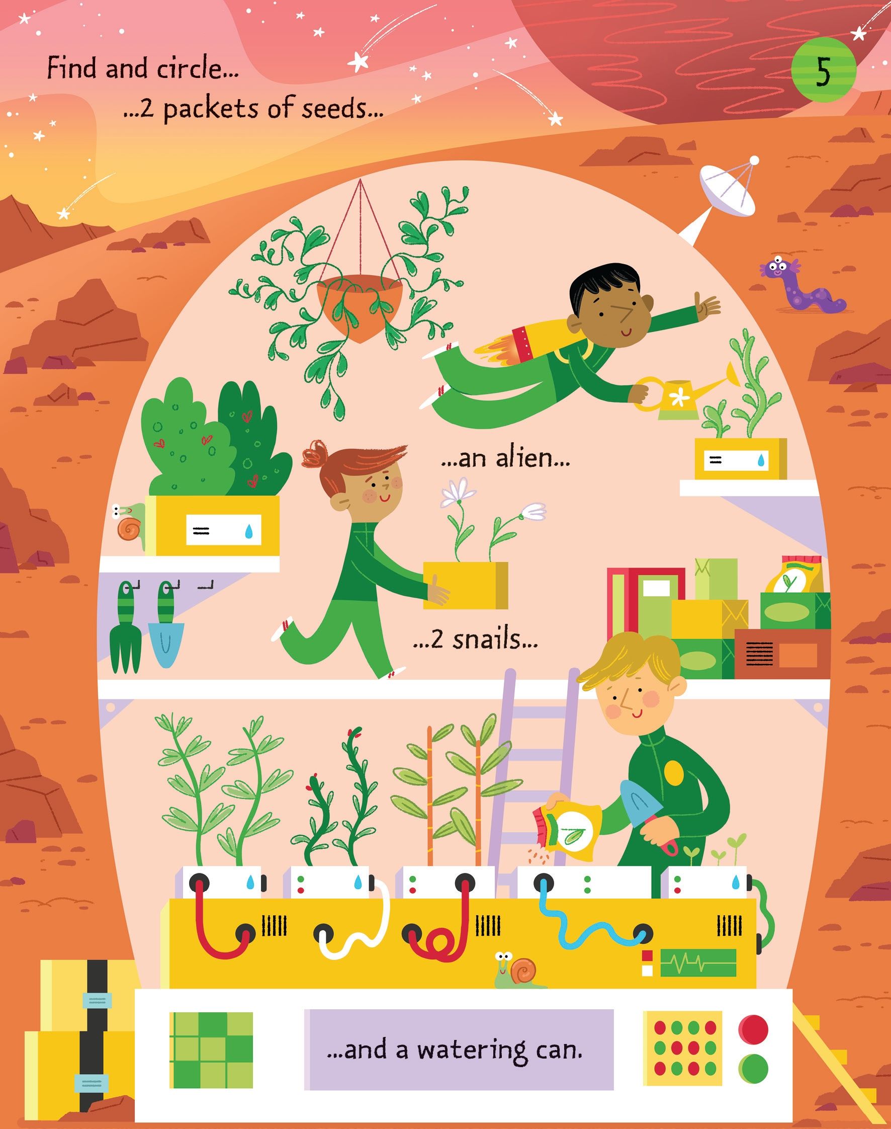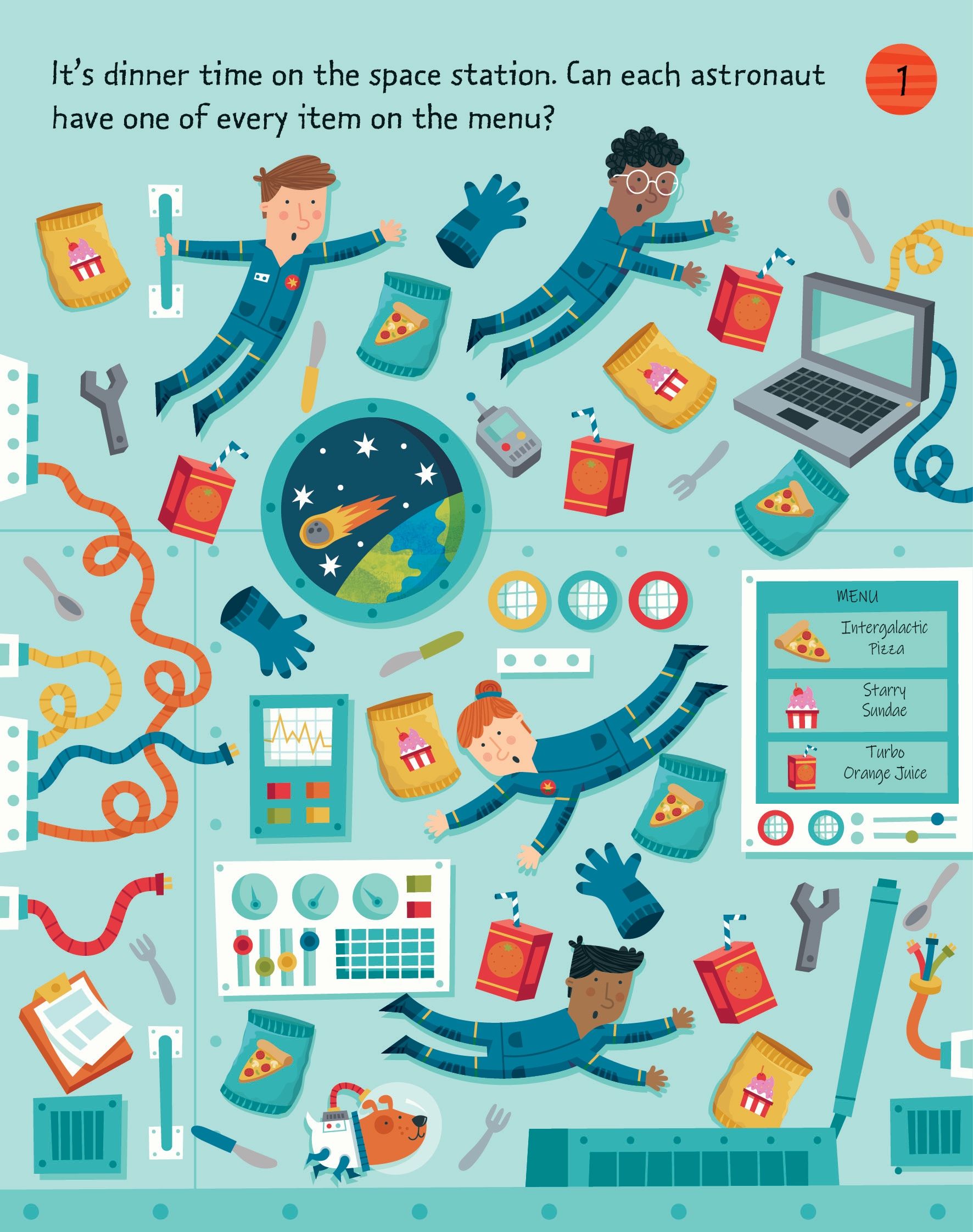 Exploreaza spațiul cosmic cu imagini, cuvinte și numere. Printre activitățile distractive se numără descifrarea unui cod extraterestru, găsirea de rute prin labirinturi galactice, detectarea diferențelor și multe altele. Toate răspunsurile se găsesc la sfârșitul caietului de lucru, ce are pagini detasabile.